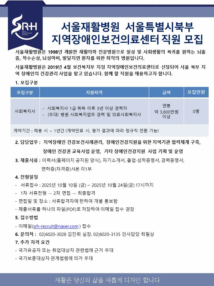 서울재활병원 서울특별시북부지역장애인보건의료센터 사회복지사 모집 공고 모집기간 2025-10-10 ~ 2025-10-24 |