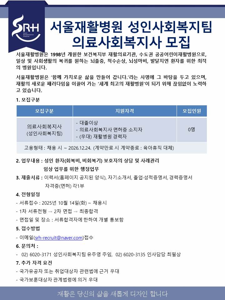 서울재활병원 성인사회복지팀 의료사회복지사 (육아휴직 대체) 모집 공고 모집기간 2025-10-14 ~ 채용시까지 |