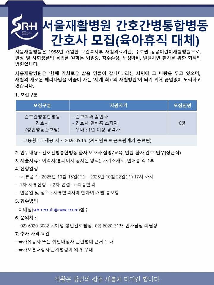 서울재활병원 간호간병통합병동 간호사(육아휴직 대체) 모집 공고 모집기간 2025-10-15 ~ 2025-10-22 |